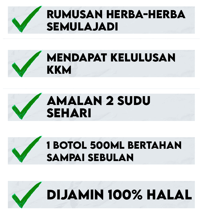 PENAFIAN: Keberkesanan produk ini bergantung kepada kesesuaian individu. Setiap hasil dari penggunaan adalah berbeza bagi setiap individu. Produk ini akan memberi kesan terbaik sekiranya pengguna mengamalkan dengan cara betul berdasarkan banyak testimoni yang diperolehi. Kita berikhtiar, tuhan yang menyembuhkan.